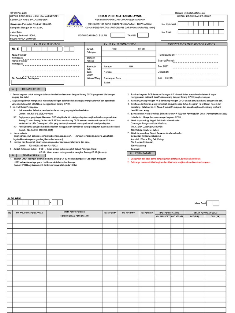 Ketua Pegawai EksekutifKetua Pengarah Hasil Dalam Negeri Lembaga Hasil Dalam Negeri Malaysia Cawangan Tuan Potongan Cukai Yang Dibuat Dalam Tahun Nama Pekerja No. Memastikan bayaran PCB adalah sama atau hampir sama dengan cukai sebenar ke arah final tax. KUALA LUMPUR - Lembaga Hasil Dalam Negeri LHDN hari ini mengumumkan pihaknya tidak lagi menerima Borang CP39 penyata potongan cukai bulanan secara manual cakera padat CD atau cakera video digital DVD pemacu pena dan cakera keras serta pembayaran secara tunai atau cek bagi Potongan Cukai Bulanan PCB daripada majikan.